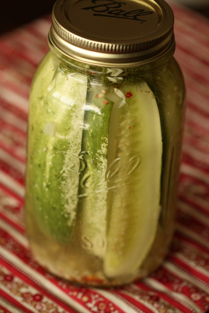 We've got lots of cucumbers at the farm right now. That means it's time to make pickles! This is a recipe for Claussen-like pickles. It's a simple, very quick pickling method. These pickles are a refrigerator pickle. They are not canned. This gives the pickles the crisp snap of a Claussen pickle. They are ready to eat about a week after you jar them and will last, refrigerated, for 6 months to a year.